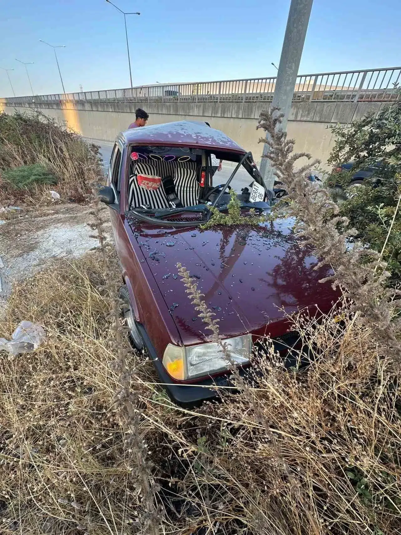 Hatay’ın Antakya ilçesinde direğe çarparak hurdaya dönen Tofaş’ta ki 2 kişi yaralandı.