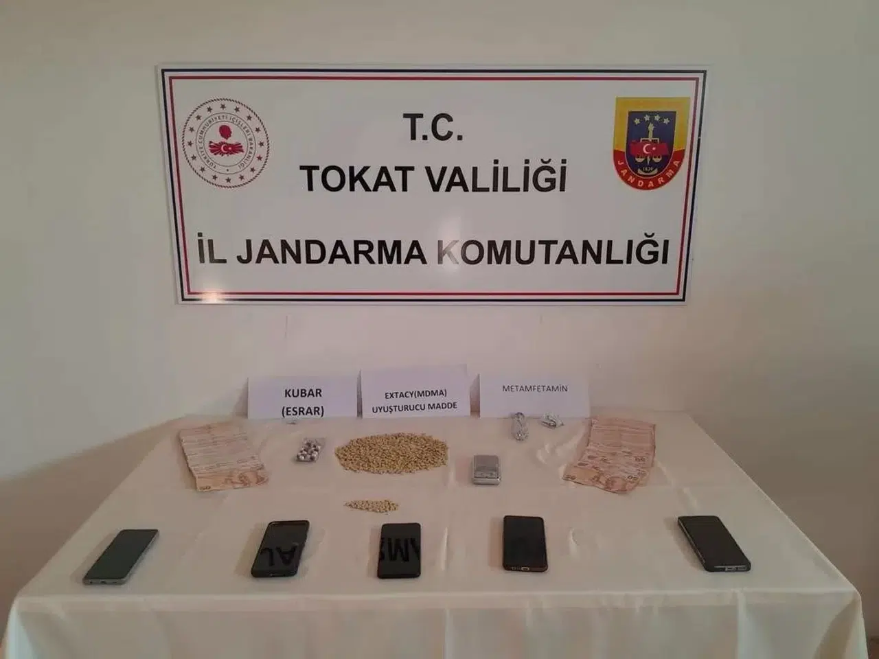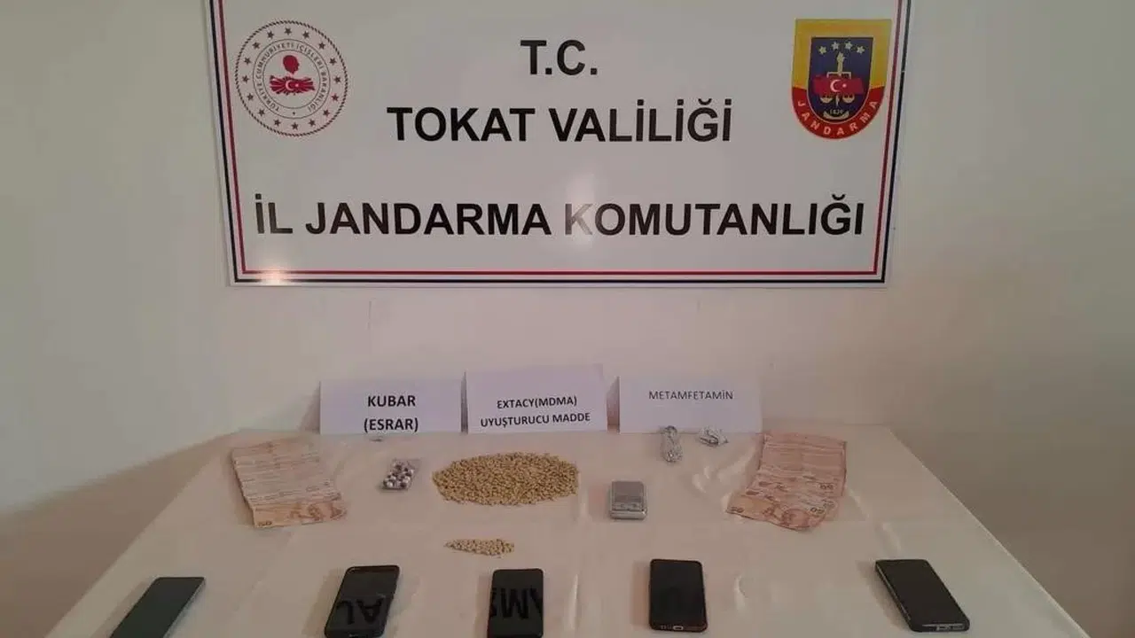 Tokat İl Jandarma Komutanlığı ekipleri kent merkezi ve Erbaa ilçesinde ikamet eden 7 şüpheli şahsın uyuşturucu ve silah mühimmat ticareti yaptığı ihbarı üzerine harekete geçti. Yapılan operasyonda 787 adet sentetik uyuşturucu hap, 39,24 gram metamfetamin, 0,8 gram toz esrar, 1 adet hassas terazi, 5 adet cep telefonu ve uyuşturucu madde satışından elde edilen 10 bin 320 Türk Lirası, 1 adet ruhsatsız tabanca, 1 adet ruhsatsız av tüfeği, 10 adet kalaşnikof fişeği ve 70 adet tabanca mühimmatı ele geçirildi. Yakalanan 7 şahıstan 3’ü tutuklanarak Tokat Kapalı Cezaevi Kurumuna gönderildi.