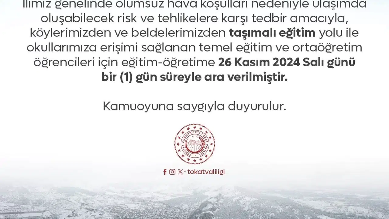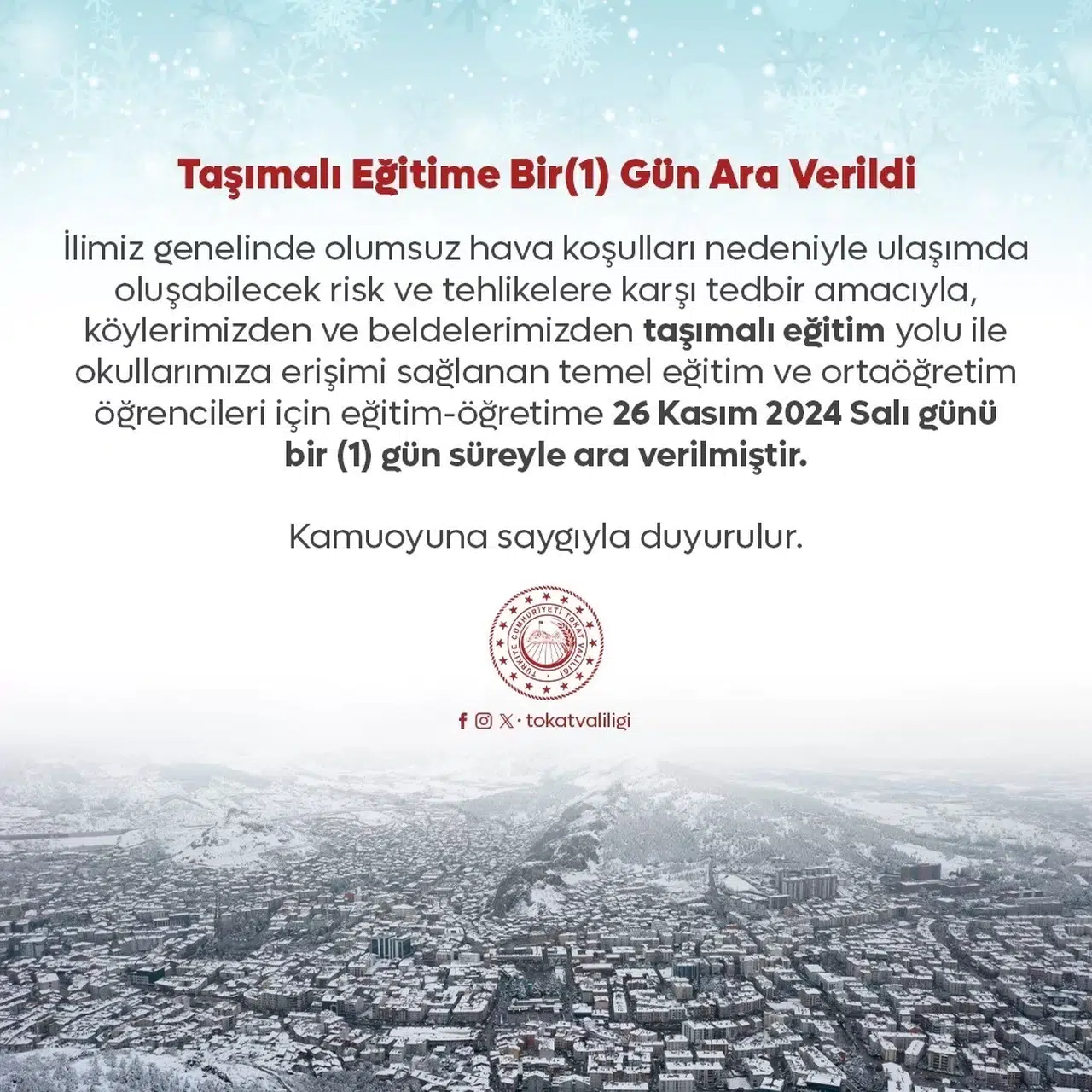 Tokat Valiliğinden yapılan açıklamada, "İlimiz genelinde olumsuz hava şartları nedeniyle ulaşımda oluşabilecek risk ve tehlikelere karşı tedbir amacıyla, köylerimizden ve beldelerimizden taşımalı eğitim yolu ile okullarımıza erişimi sağlanan temel eğitim ve ortaöğretim öğrencileri için eğitim-öğretime 26 Kasım 2024 Salı günü, 1 gün süreyle ara verilmiştir" denildi.