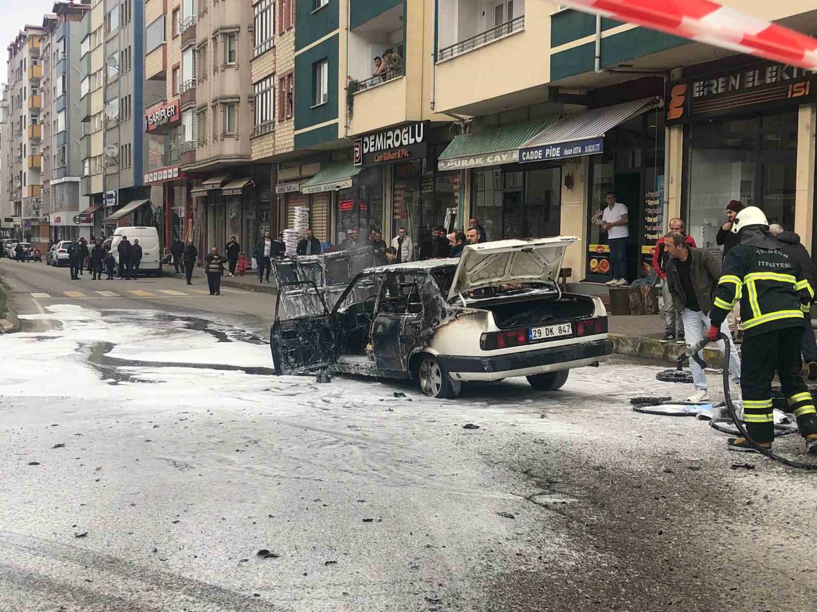 Trabzon’un Vakfıkebir ilçesinde sokak ortasında bir araç alev alev yandı.