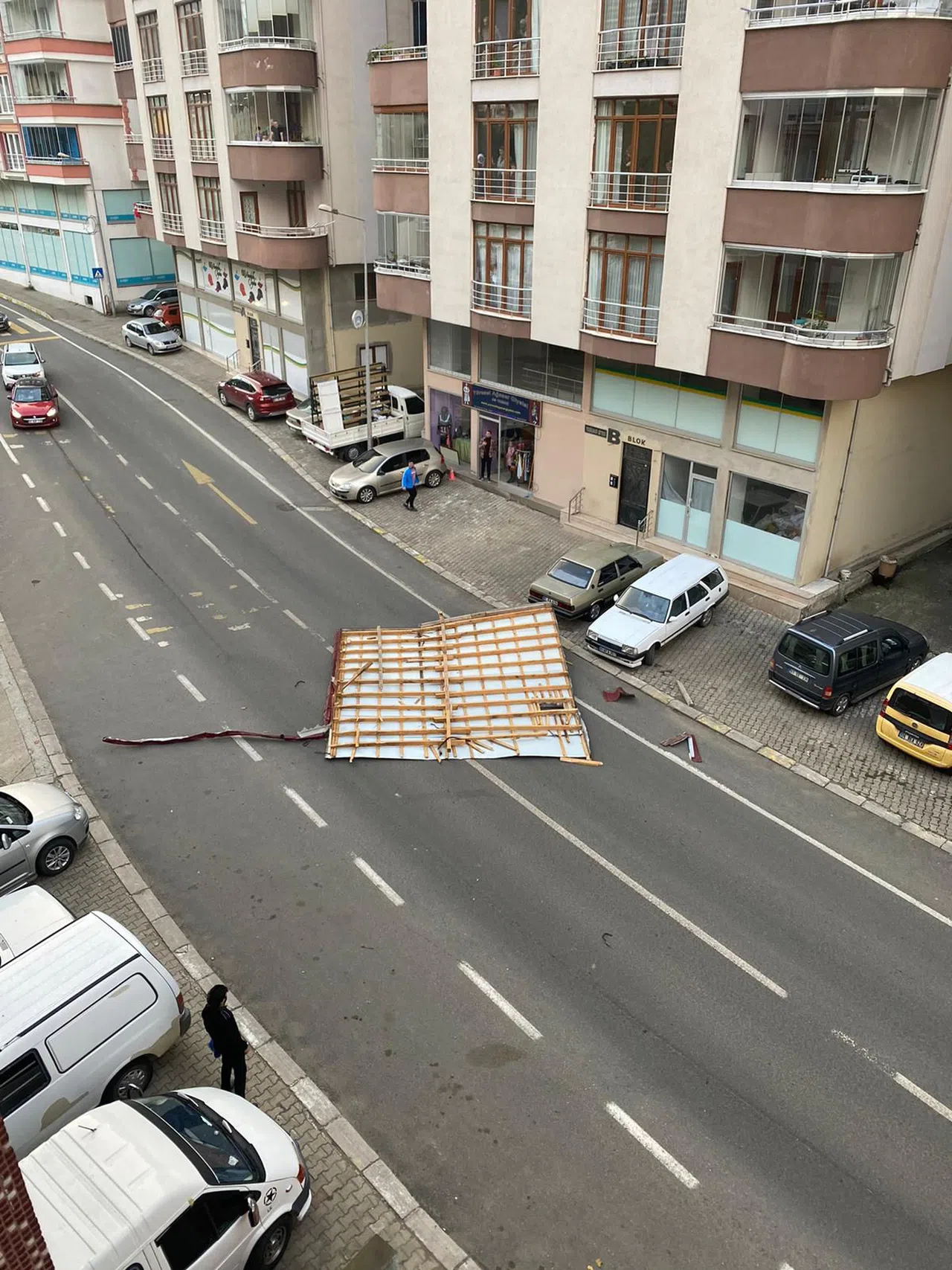 TRABZON (AA) - Trabzon'da kuvvetli rüzgar nedeniyle uçan apartman çatısının, yoldan geçen kişinin yanına düşmesi cep telefonuyla kaydedildi.