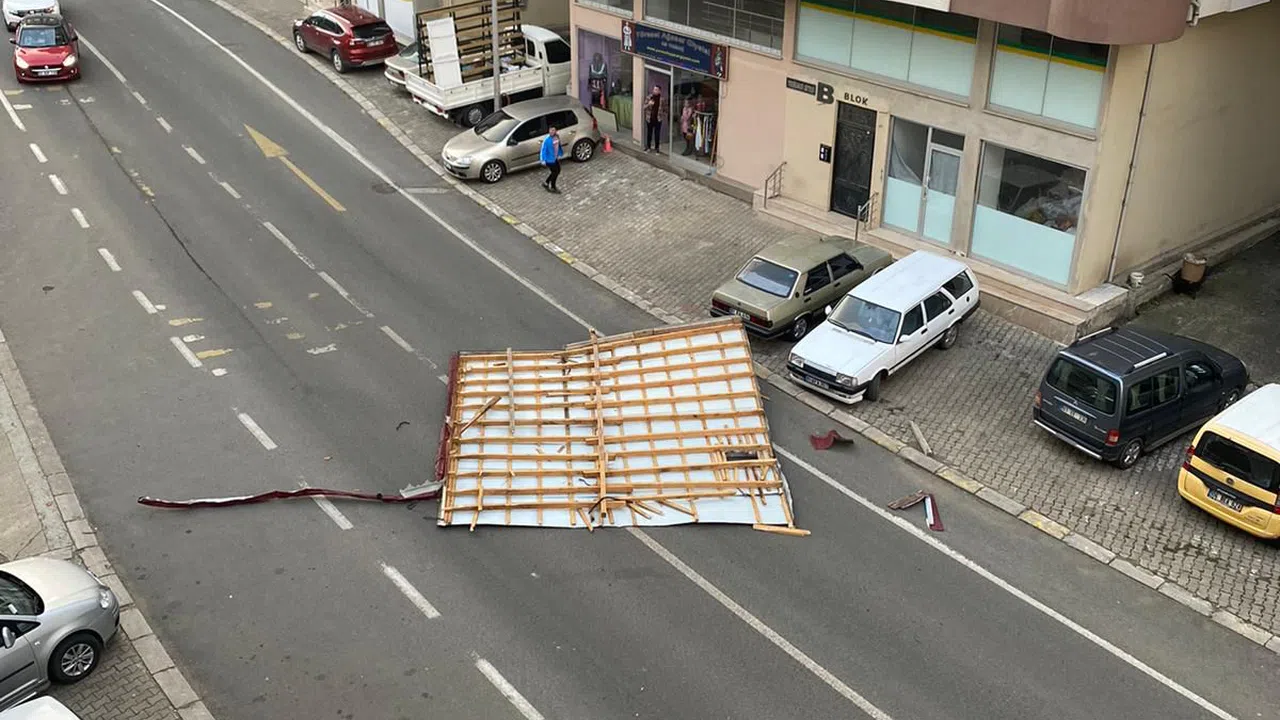 Şalpazarı ilçesinde öğle saatlerinde şiddetini artıran rüzgar nedeniyle Kireç Mahallesi'ndeki 4 katlı apartmanın çatısı koparak ana yola düştü.