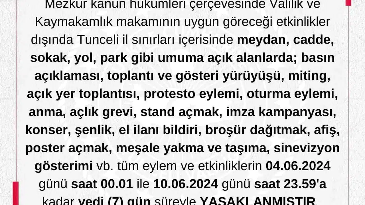 Tunceli Valiliğinden yapılan açıklamada, ’’Mezkur kanun hükümleri çerçevesinde valilik ve kaymakamlık makamının uygun göreceği etkinlikler dışında Tunceli il sınırları içerisinde meydan, cadde, sokak, yol, park gibi umuma açık alanlarda basın açıklaması, toplantı ve gösteri yürüyüşü, miting, açık yer toplantısı, protesto eylemi, oturma eylemi, anma, açlık grevi, stant açmak, imza kampanyası, konser, şenlik, el ilanı bildiri, broşür dağıtmak, afiş, poster açmak, meşale yakma ve taşıma, sinevizyon gösterimi gibi tüm eylem ve etkinliklerin 4 Haziran saat 00.01 ile 10 Haziran saat 23.59’a kadar 7 gün süreyle yasaklanmıştır’’ denildi.
