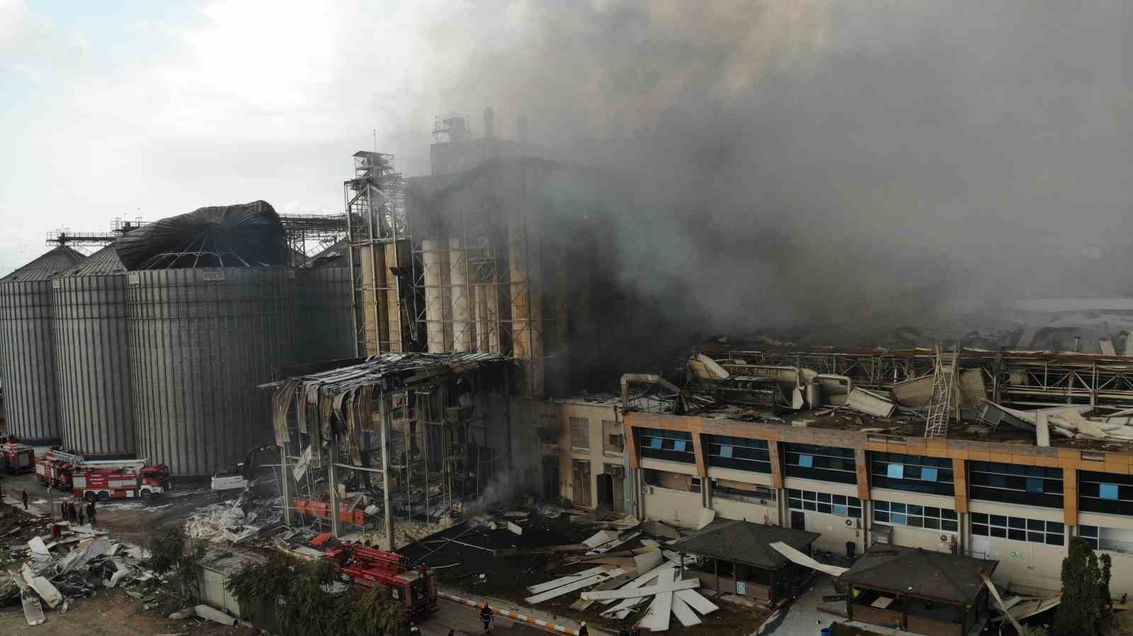 Sakarya’nın Hendek ilçesinde Oba Makarna fabrikasında patlama sonrasında çıkan ve yaklaşık 3 saat sonra kontrol altına alınmasına rağmen soğutma çalışmalarının devam ettiği yangın havadan görüntülendi.