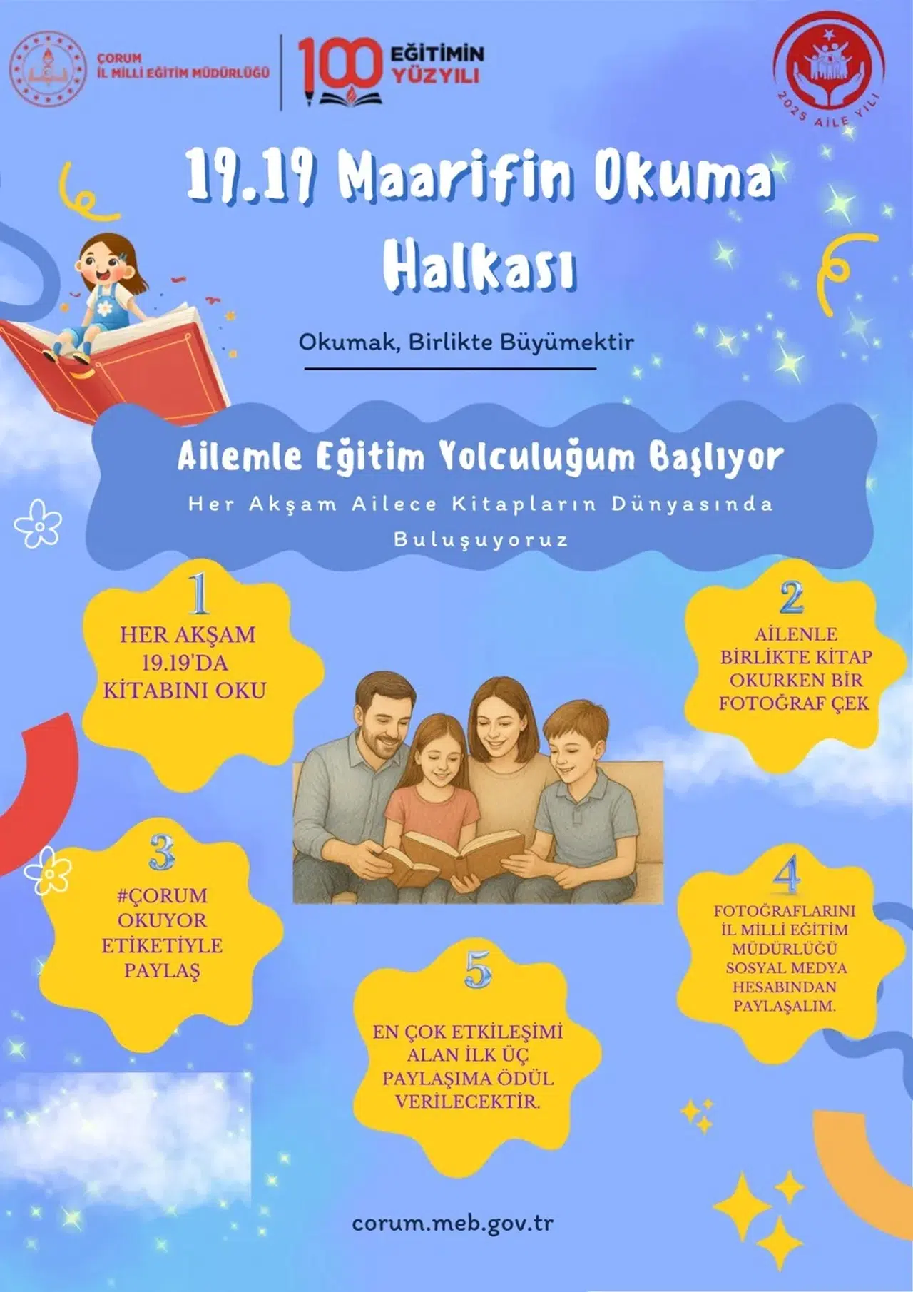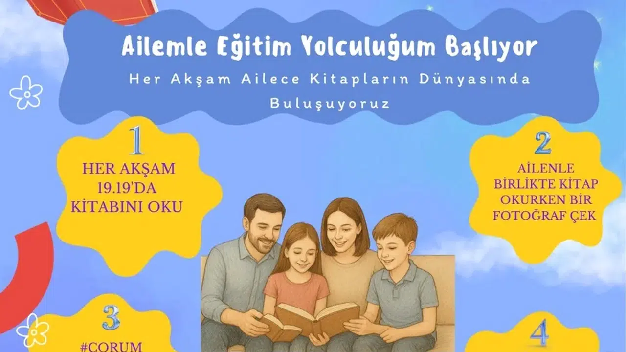 Türkiye Yüzyılı’nın Eğitim Yüzyılı vizyonu ve 2025 Aile Yılı kapsamında başlatılan proje ile Çorum'daki öğrencilerin, her akşam saat 19.19'da anne ve babalarıyla birlikte aynı masa etrafında kitaplarını açarak, ekranlardan uzak bir şekilde nitelikli zaman geçirmesi hedefleniyor.