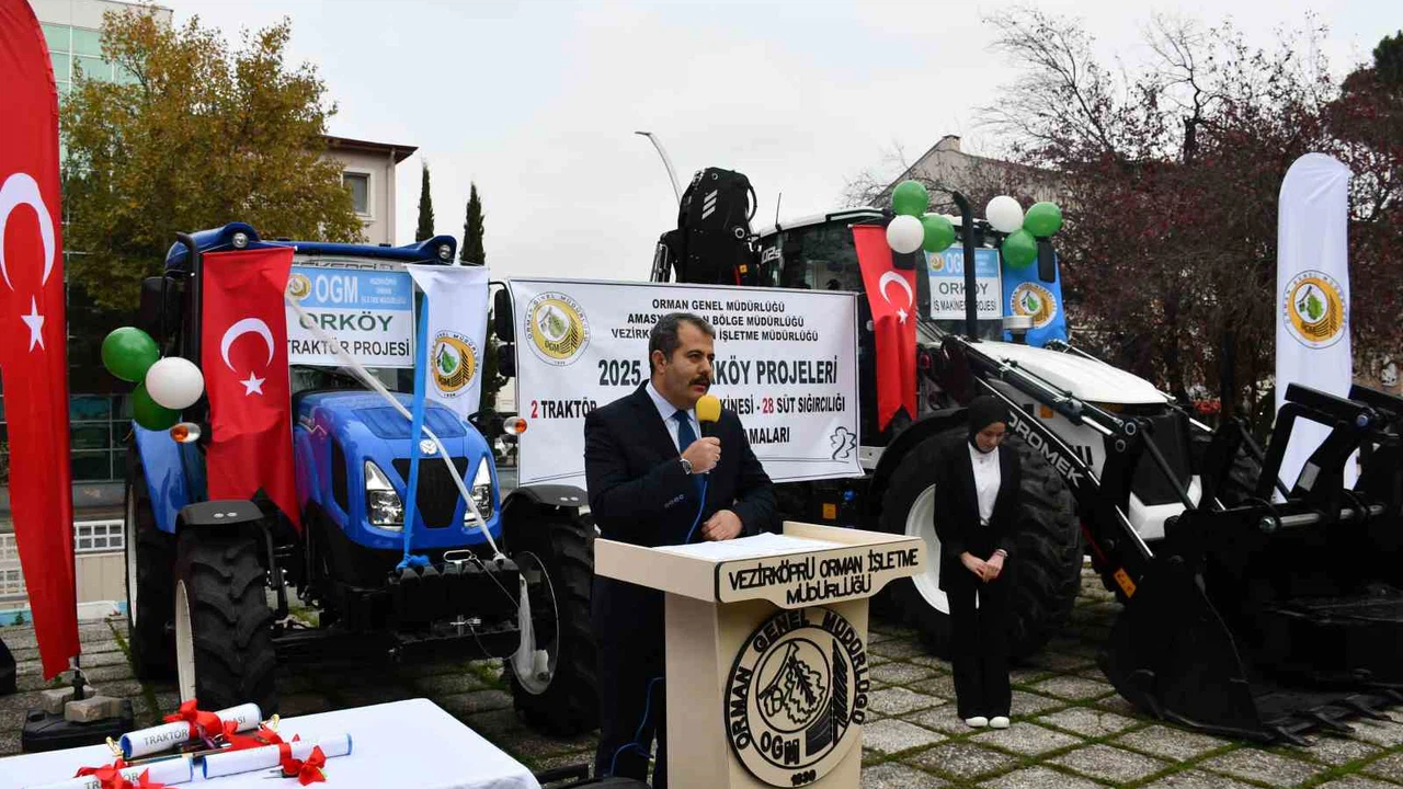 Vezirköprü Orman İşletme Müdürü Mecit Koçak yaptığı konuşmada, "ORKÖY kredili ve yüzde 20 hibeli iş makinesi, traktör, tambur ve süt sığırcılığı kapsamında 28 adet inek dağıttık" dedi.