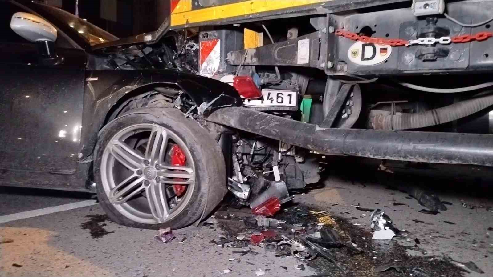 Olay, İstanbul Ümraniye İlçesi Mehmet Akif Mahallesi, Tavukçuyolu Caddesi üzerinde dün saat 19.00 sıralarında yaşandı. İddiaya göre, sürücüsünün ismi öğrenilemeyen Audi marka 34 CAP 75 plakalı lüks otomobil, seyir halindeyken virajı alamayarak, yolun sağında park halinde bulunan vince çarptı. Kazada ölen veya yaralanan olmazken, lüks araç kullanılamaz hale geldi. Durumun bildirilmesi üzerine olay yerine itfaiye ekipleri, polis ekipleri ve sağlık ekipleri sevk edildi. Olay yerine gelen polis ekipleri olayla ilgili inceleme başlatırken araç sürücüsü ifadesi alınmak üzere polis merkezine götürüldü.