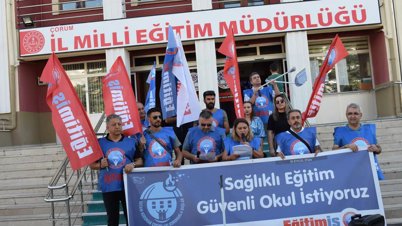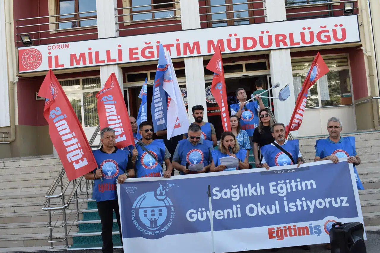 Eğitim-İş Sendikası Çorum Şubesi, “sağlıklı eğitim” ve “güvenli okul” talebiyle İl Milli Eğitim Müdürlüğü önünde kitlesel basın açıklaması yaptı.
