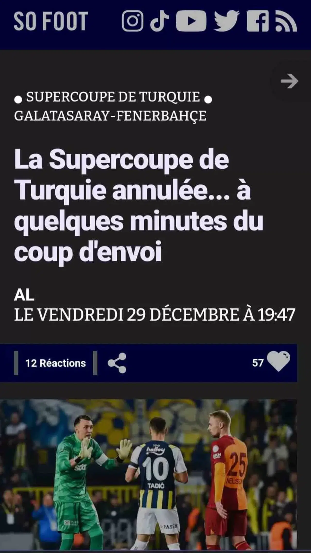 Fransız So Foot, maça çıkmama kararıyla ilgili, “Bir karmaşa daha: Fenerbahçe, “Yurtta sulh, cihanda sulh" yazılı pankart açmak isterken, Galatasaray da “Ne mutlu Türk’üm diyene" yazılı pankart açmak istedi. Burada da Suudi Arabistan bu girişimi resmen reddetti. Türk gazetecilerin haberine göre, iki kulübün başkanları Dursun Özbek ve Ali Koç, TFF Başkanı ile istişarede bulunarak, organizasyonun yapılabilmesi için uzlaşma sağlamaya çalıştı. Maç saatinin gelmesine ve yerel taraftarların tribünlerde bulunmasına rağmen maç resmi olarak iptal edildi. Her iki takımın da gece İstanbul’a dönmeyi planlıyor” denildi.