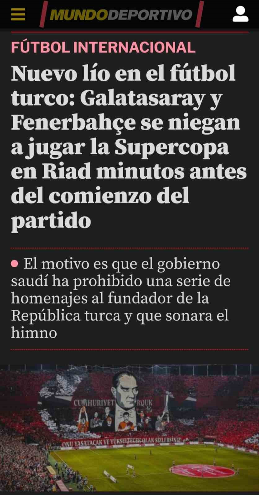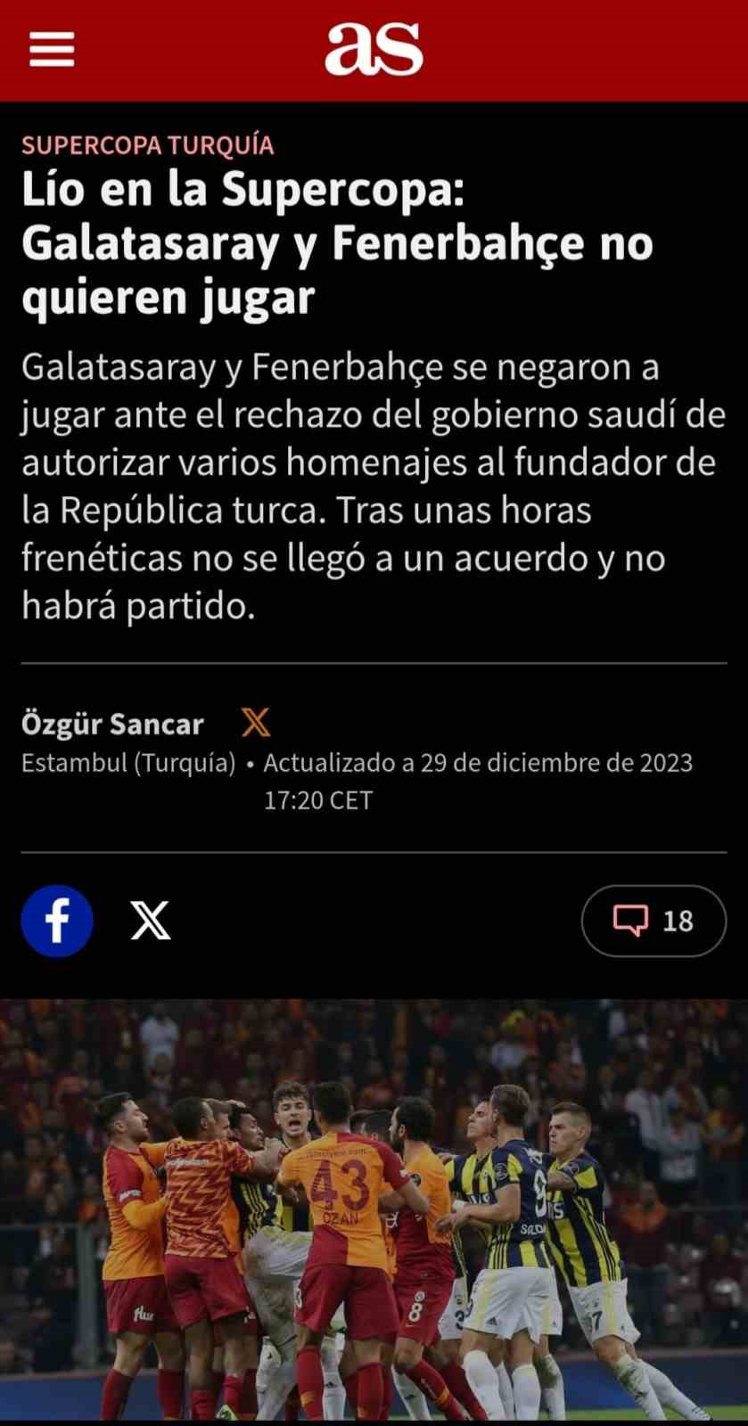 Marca ise, “Türk futbolundan son gelişmeleri aktarıyoruz: Galatasaray ile Fenerbahçe bu öğleden sonra Türkiye Süper Kupa finali oynayacaktı. Para kazanmak amacıyla ve Türkiye Cumhuriyeti’nin bağımsızlığının 100. yılı anısına Suudi Arabistan’a getirilen muhteşem bir maç. Maçın oynanmasına birkaç dakika kala ara verildi. Bunun nedeni, Suudi yetkililerin, ısınma sırasında her iki kulübe de Mustafa Kemal Atatürk onuruna anma töreni yapılmasına (görünüşe göre antrenman formaları ve pankartlar) izin vermemesidir. Daha önce müzakere edilmemiş siyasi bir neden. Atatürk, bugün 100. yılını kutlayan Türkiye Cumhuriyeti’nin büyük kurucusu ve ilk cumhurbaşkanıdır. Öğleden sonra Riyad’da bir otelde ev sahibi ülkenin yetkilileri, Türkiye Spor Bakanı ve her iki takımın başkanları arasında uzun bir toplantı yapıldı ancak anlaşma sağlanamadı. Karşılaşma ileri bir tarihe ertelendi” cümlelerine yer verdi.