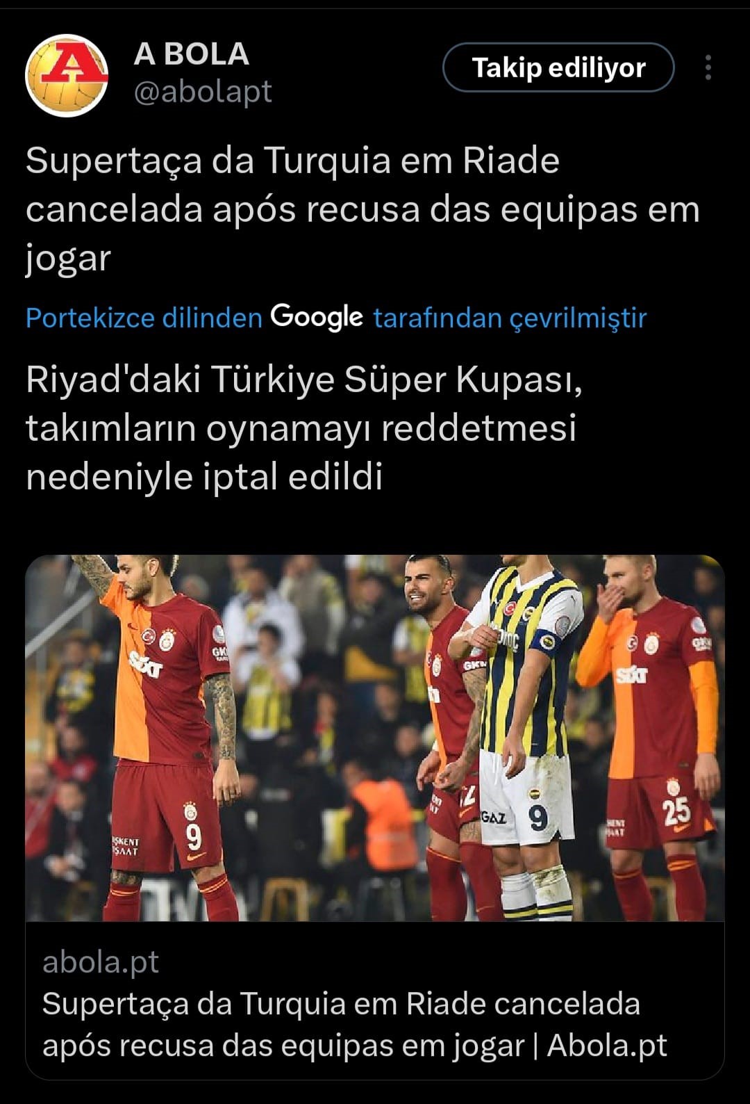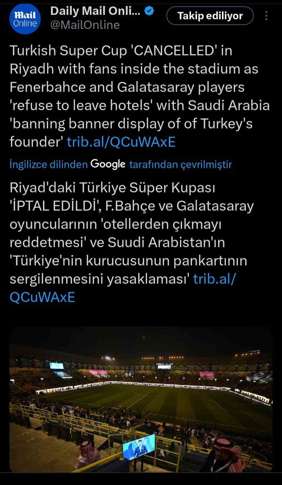 AS’ta yer alan haberde, “Galatasaray ve Fenerbahçe, Suudi hükümetinin Türkiye Cumhuriyeti’nin kurucusuna çeşitli anma törenleri yapması reddetmesi nedeniyle oynamayı reddetti. Birkaç beklenen saatin ardından anlaşmaya varılamadı ve oyun oynanmayacak” ifadeleri kullanıldı.