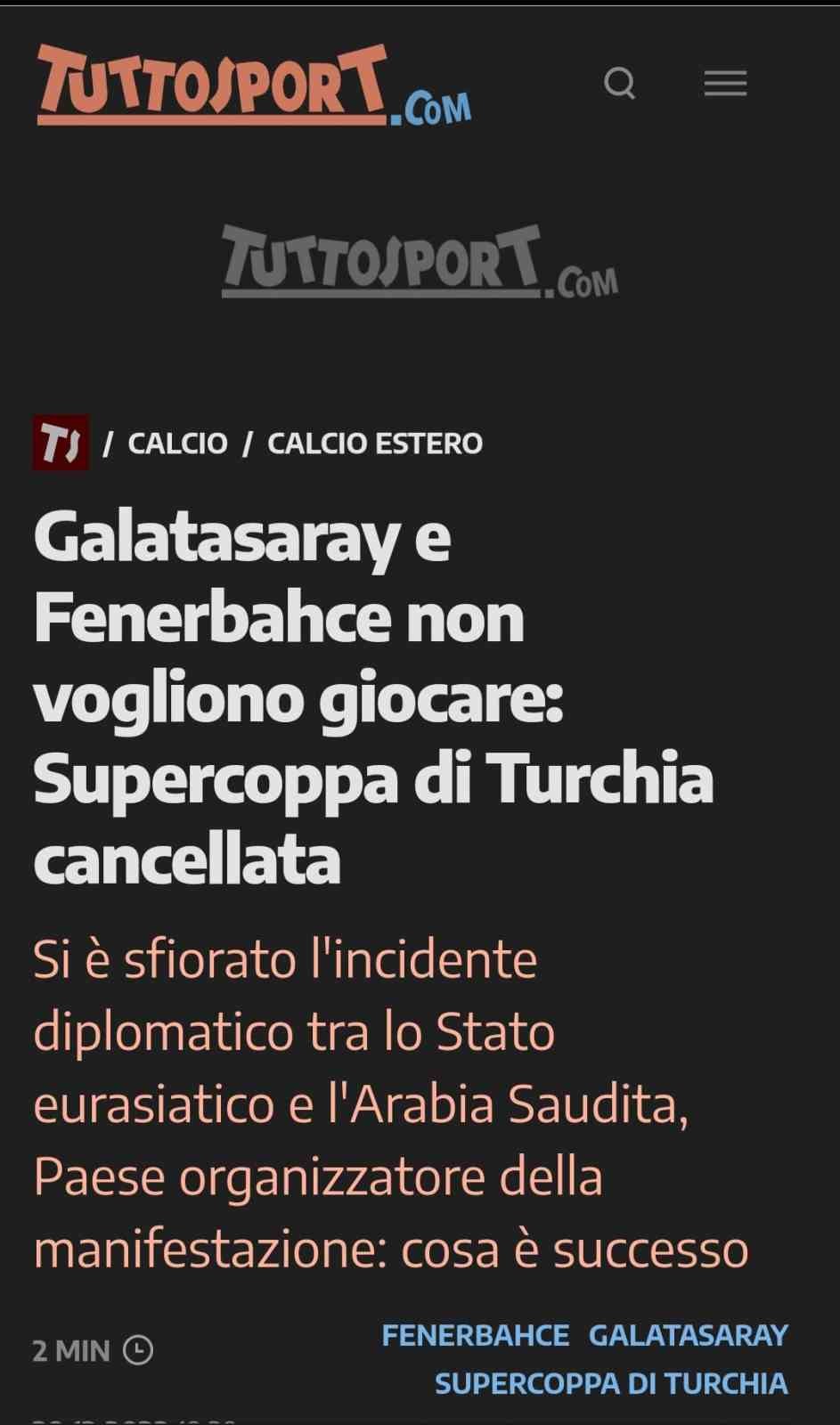 İtalyan Tuttosport’da da gerçekleşen maça çıkmama kararıyla ilgili yapılan haberde, “Riyad’da yapılması planlanan Türkiye Süper Kupası için geçerli olan ve yılbaşı arifesinde şampiyonun belli olacağı, Mauro Icardi’nin Galatasaray’ı ile Edin Dzeko’nun Fenerbahçe’si arasında oynanacak derbi maçı oynanmayacak. Her iki kulüp de İstanbul’a dönmüş olup, kupanın daha sonra ileri bir tarihte oynanacak şekilde iptal edilmesine karar verildi” şeklinde paylaşıldı.