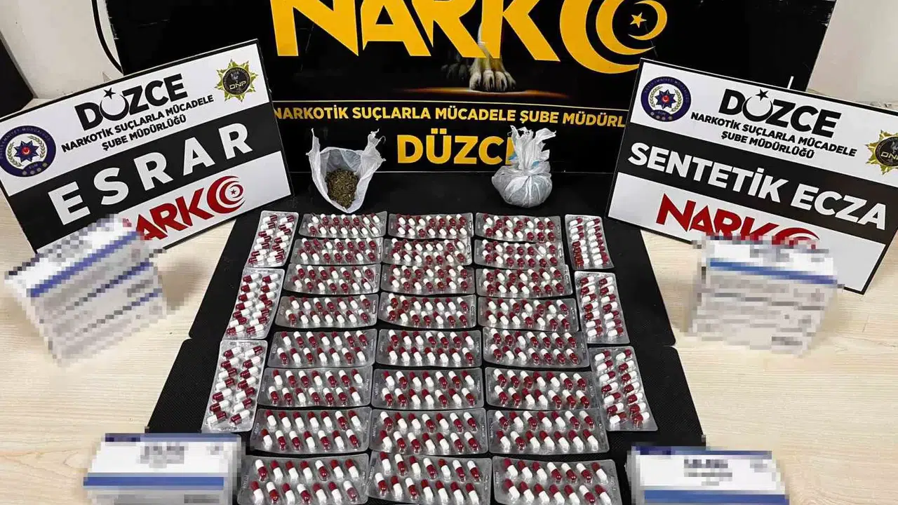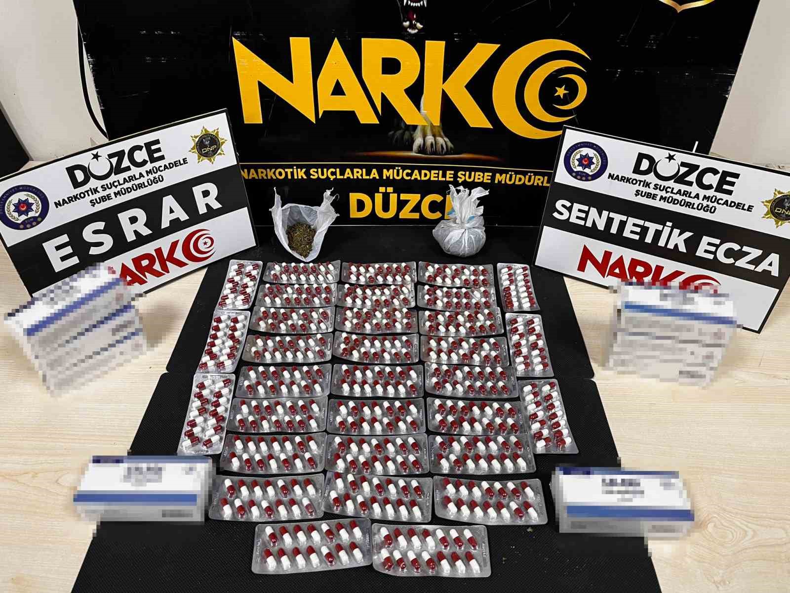 Düzce Cumhuriyet Başsavcılığı’nın uyuşturucu madde ticaretinin önlenmesine yönelik yürüttüğü soruşturmalar sürüyor. Düzce İl Emniyet Müdürlüğü Asayiş ekipleri tarafından Cumhuriyet Mahallesi Tütüncü Caddesi üzerinde yapılan kontrollerde şüphe üzerine durdurulan Bolu plakalı araç durduruldu. Sürücü mahalinde bulunan 9 suç kaydı bulunan E.F.(36) sahsa ait 224 adet uyuşturucu ve uyarıcı hap, yanında bulunan 26 suç kaydı bulunan R.D. isimli şahsa ait 224 adet uyuşturucu ve uyarıcı hap ve 40 gram esrar maddesi olmak üzere toplamda 448 adet uyuşturucu ve uyarıcı hap ele geçirildi. Gözaltına alınan şüpheli iki şahıs çıkarıldığı adli makamlarca tutuklandı.