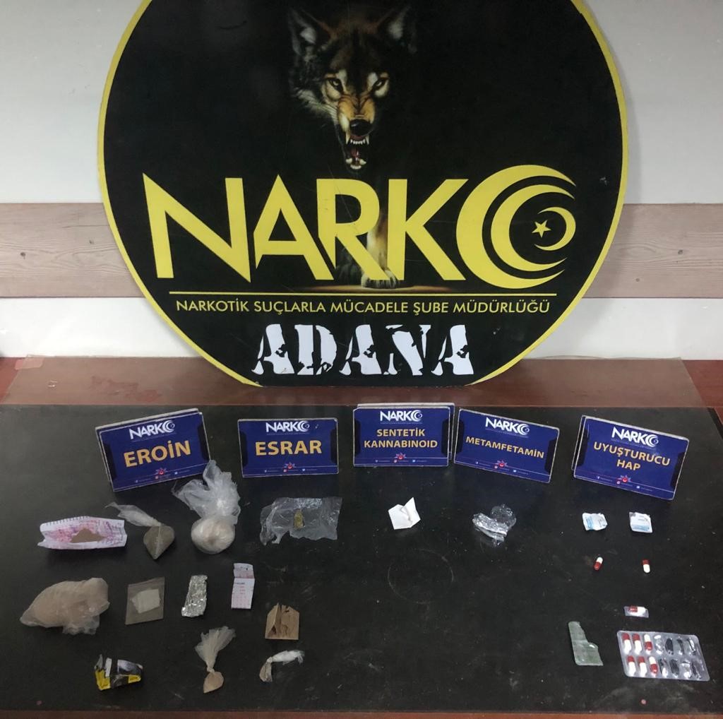 Adana Emniyet Müdürlüğü Narkotik Suçlarla Mücadele Şube Müdürlüğü ekipleri, uyuşturucu satıcılar yönelik yaptığı çalışmalarda Seyhan ilçesine bağlı Tellidere Mahallesinde Murat K., ve Sitem D.’yi yakaladı. Yakalanan şüphelilerin üzerlerinde yapılan arama çalışmasında 11 pakette 99 gram eroin, 14 uyuşturucu hap, 0.53 gram esrar, 0.56 gram bonzai ile 0.74 gram metamfetamin ele geçirdi.