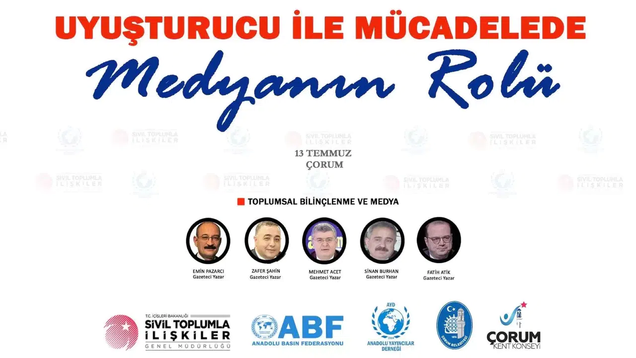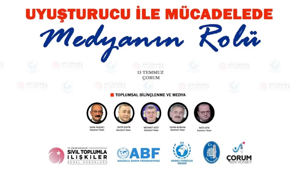 Anadolu Yayıncılar Derneği tarafından düzenlenen “Uyuşturucu ile Mücadelede Medyanın Rolü” paneli, Anadolu Basın Federasyonu katkıları ve İçişleri Bakanlığı Sivil Toplumla İlişkiler Genel Müdürlüğü destekleriyle Çorum’da yapılacak.