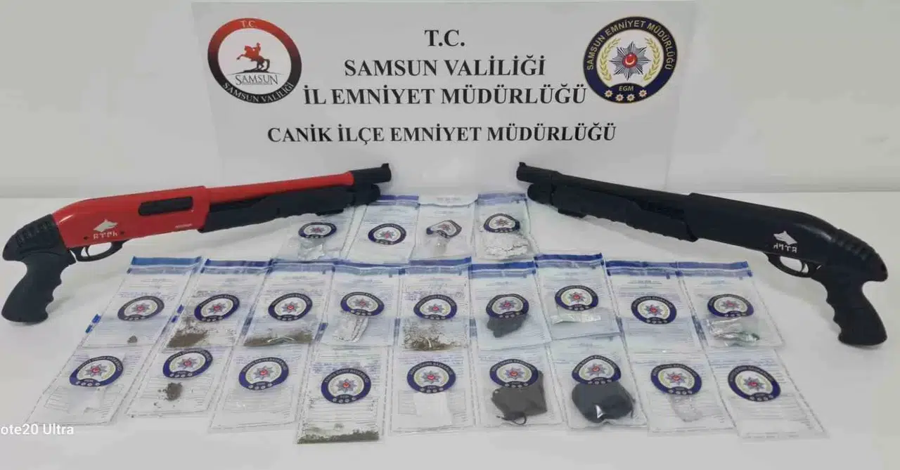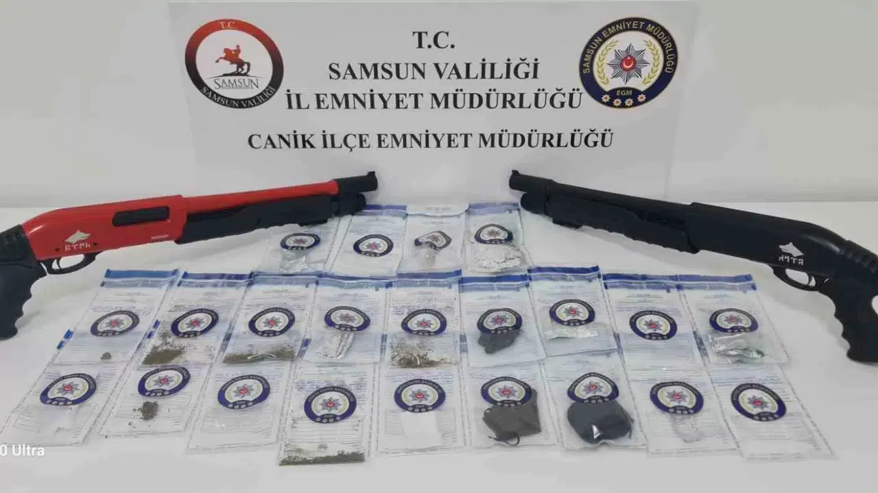 İl Emniyet Müdürlüğü ekiplerince uyuşturucu tacirlerinin yakalanmasına yönelik yapılan çalışmalar kapsamında Canik ilçesinde bulunan bir ikamete operasyon düzenlendi. Yapılan operasyonda 3 adet ayrı folyoda sarılı 2,76 gram metamfetamin, 6 adet ayrı folyoda sarılı 2,08 gram esrar, 2 adet pompalı tüfek, 1 adet uyuşturucu kullanım aparatı ele geçirildi. 5 şahıs da yakalanarak gözaltına alındı ve haklarında adli tahkikat başlatıldı.