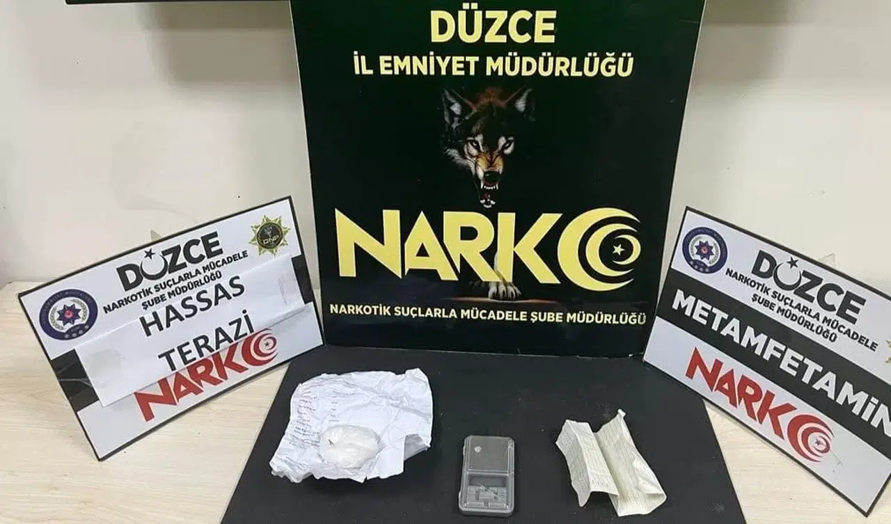 Düzce Cumhuriyet Başsavcılığının koordinesinde Narkotik Suçlarla Mücadele Şube Müdürlüğü ekipleri tarafından otoyol üzerinde bir araç durduruldu. S. A. ve O. Y. isimli şahısların bulunduğu araçta yapılan aramada 2 parça halinde toplam 70 gram Metanfetamin maddesi ve 1 adet çalışır vaziyette hassas terazi ele geçirildi. Her iki şüphelide Cumhuriyet Başsavcılığı tarafından sevk edildiği nöbetçi sulh ceza mahkemesi tarafından tutuklandı.