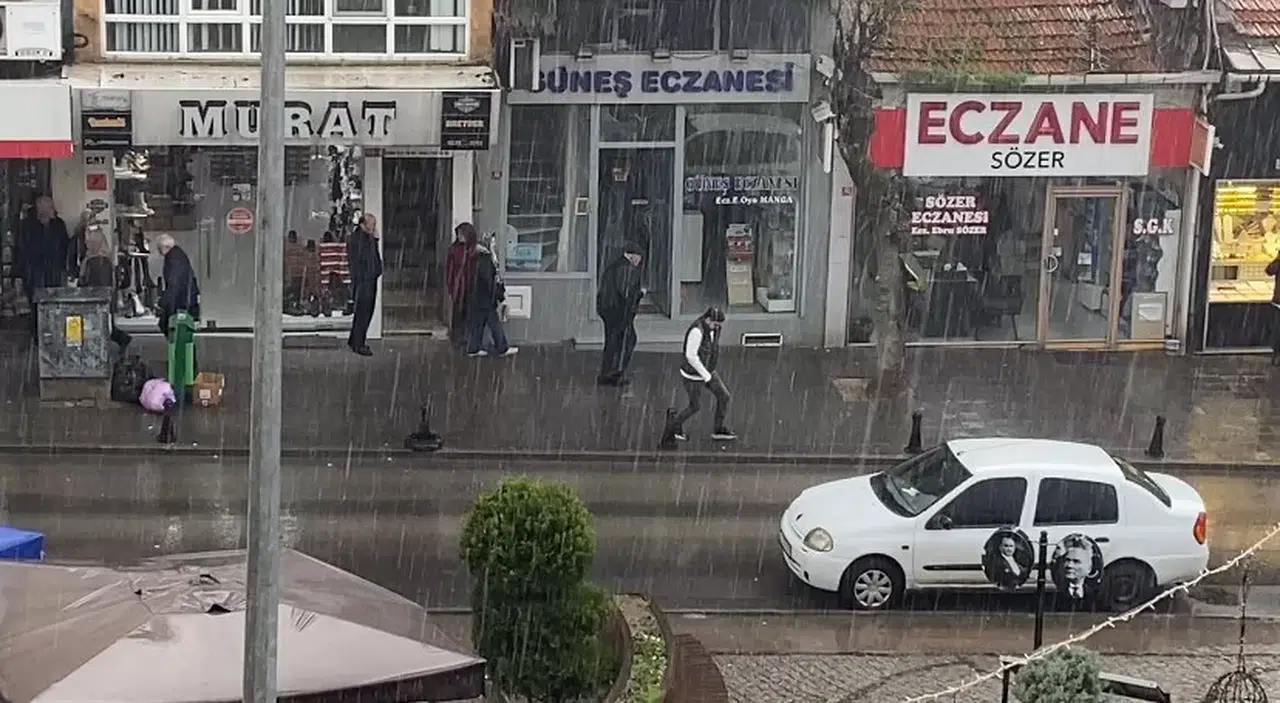 Edirne’nin Uzunköprü ilçesinde aniden başlayan şiddetli yağmur, etkili olmaya devam ediyor. Yollarda su birikintileri oluşurken, yağışa hazırlıksız yakalanan vatandaşlar, saçak altlarına sığındı.