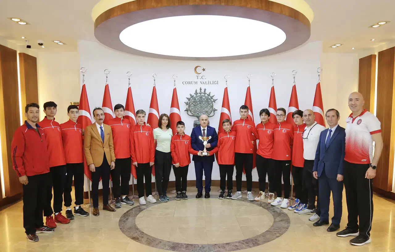 Çorum Valisi, Türkiye finallerinde şampiyon olan öğrenci ve öğretmenleri makamında kabul etti.