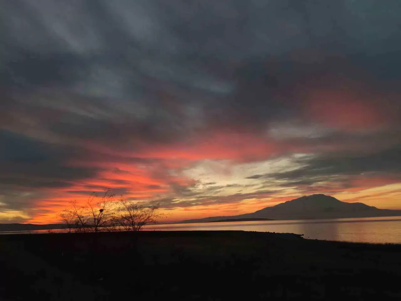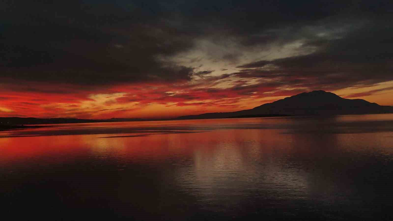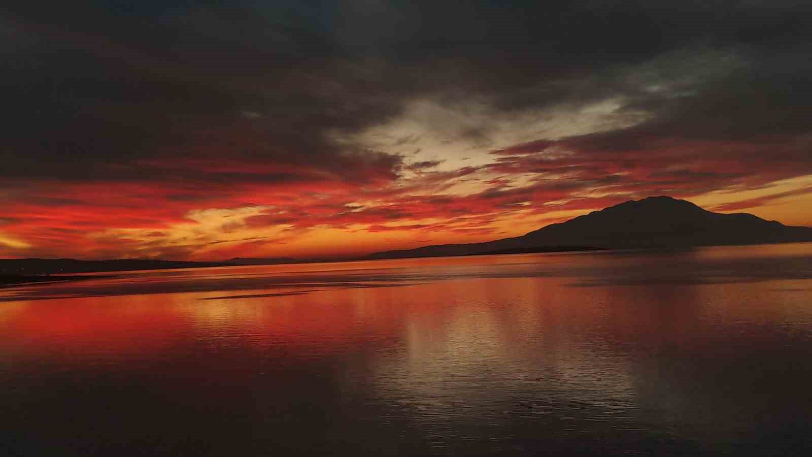 Gün batımının en güzel izlendiği yerlerden biri olan Van Gölü, bu sefer farklı bir güzelliğe eşlik etti. Bulutların kızıl renginin Süphan Dağı’nın heybetli görünümü ile birleştiği manzara, kartpostallık görüntüler ortaya çıkardı. Bulutların yoğunlaşarak suya yansıması ve gün batımıyla birlikte kızıla bürünmesi kameralara yansıdı. Manzara, görenleri mest etti.