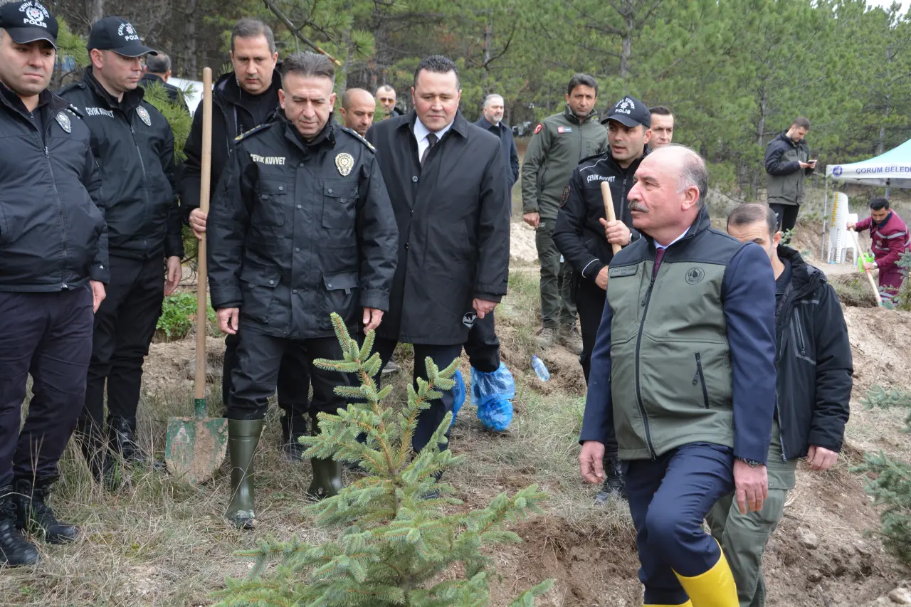 Ardından Çorum Valisi Çalgan, Cumhuriyet Başsavcısı Ahmet Bektaş, Çorum Belediye Başkan Yardımcısı Yağbat, İl Emniyet Müdürü Arif Pehlivan, İl Jandarma Komutanı Jandarma Kıdemli Albay Kubilay Ayvaz, İl Müftüsü Şahin Yıldırım, Aile ve Sosyal Hizmetler İl Müdürü Sahit Aydın, Gençlik ve Spor İl Müdürü Mustafa Demirkıran, İl Milli Eğitim Müdürü Cemil Çağlar, Amasya Orman Bölge Müdür Yardımcısı Mehmet Kurumeşe, öğrenciler ve öğretmenler birlikte fidan dikti.