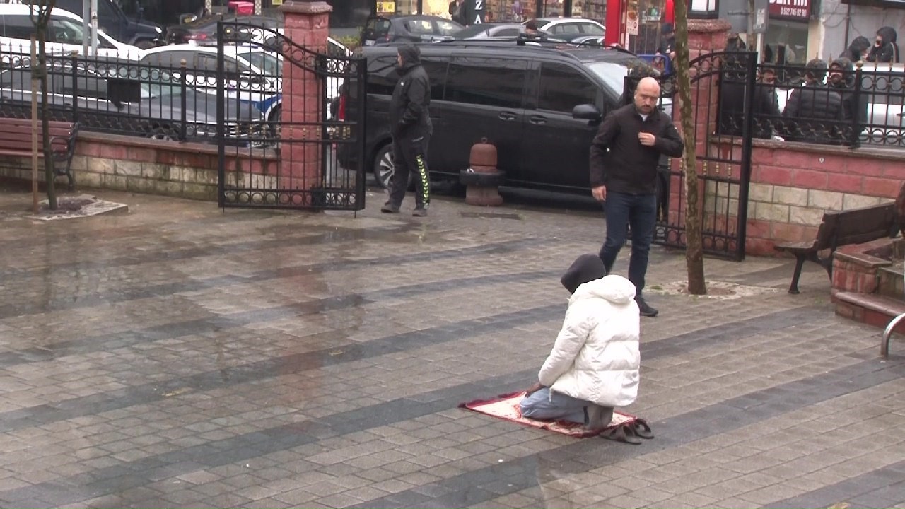 Beykoz’da bir vatandaş, sağanak yağmur altında namazına devam etti. Yağmura aldırış etmeyen vatandaşın o anları ise çevredeki vatandaşların kamerasına yansıdı.