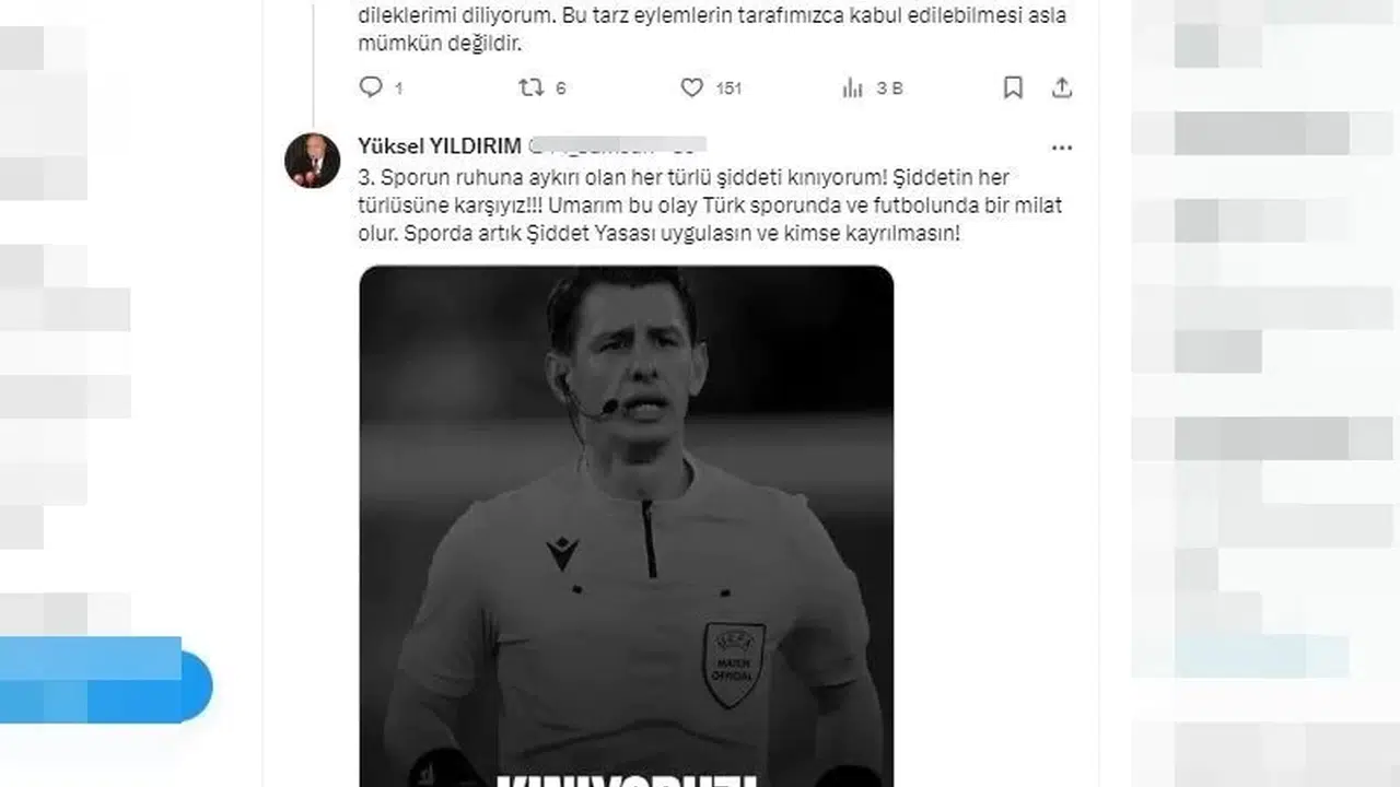Hakemlere karşı olan tepkilerini centilmence gösterdiklerinin altını çizen Yüksel Yıldırım, “Bu sezon bazı müsabakalarımızda yapılan haksız hakem kararları karşısında centilmence açıklama yapmayı prensip edinen Samsunspor Başkanı olarak, MKE Ankaragücü - Çaykur Rizespor maçının hakemi Halil Umut Meler’e yapılan çirkin fiziksel saldırıyı kınıyorum. Müsabakanın Hakemi Halil Umut Meler ve ekibine geçmiş olsun dileklerimi diliyorum. Bu tarz eylemlerin tarafımızca kabul edilebilmesi asla mümkün değildir. Sporun ruhuna aykırı olan her türlü şiddeti kınıyorum! Şiddetin her türlüsüne karşıyız. Umarım bu olay Türk sporunda ve futbolunda bir milat olur. Sporda artık ‘Şiddet Yasası’ uygulasın ve kimse kayrılmasın” dedi.