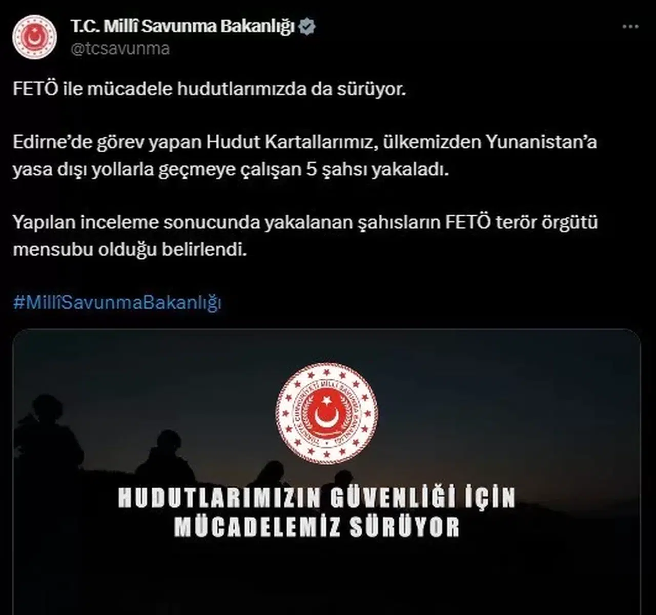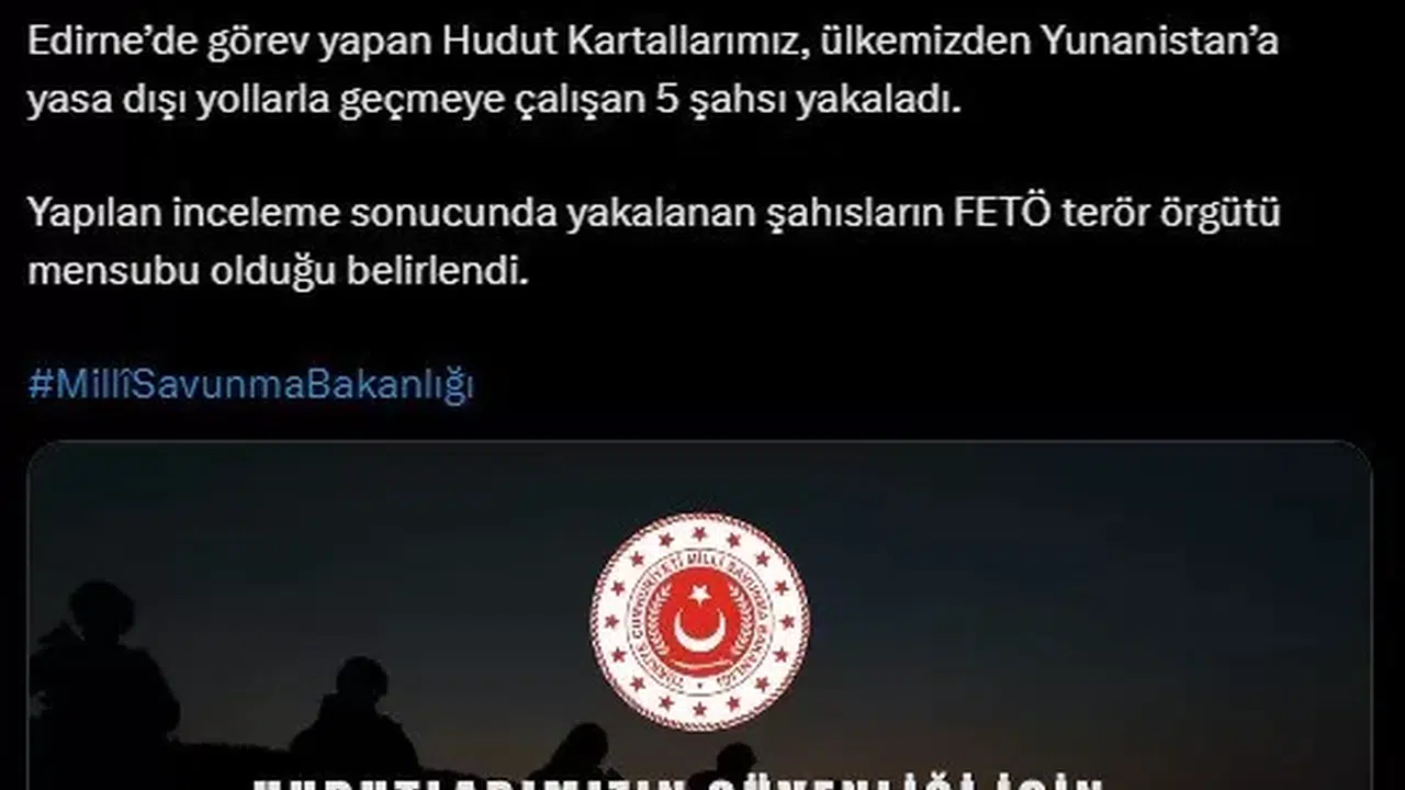 Milli Savunma Bakanlığının sosyal medya hesabından yapılan açıklamada, Türkiye’nin FETÖ ile mücadelesinin hudutlarda da devam ettiği vurgulanarak, “Edirne’de görev yapan Hudut Kartallarımız, ülkemizden Yunanistan’a yasa dışı yollarla geçmeye çalışan 5 şahsı yakaladı. Yapılan inceleme sonucunda yakalanan şahısların FETÖ terör örgütü mensubu olduğu belirlendi” ifadelerine yer verildi.
