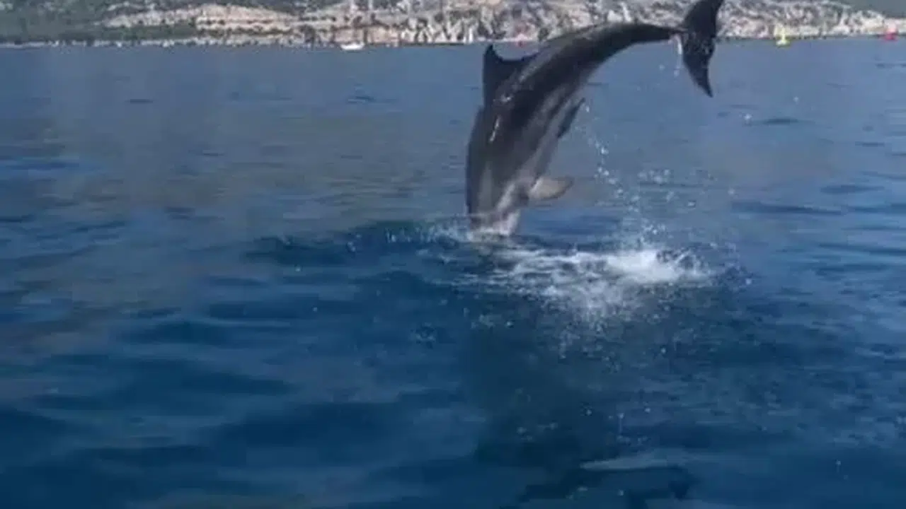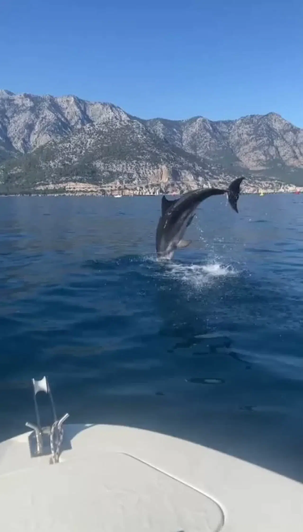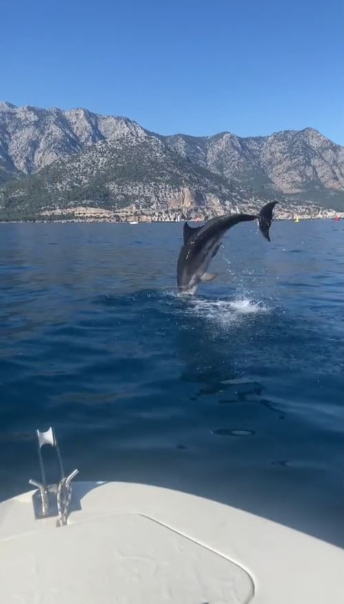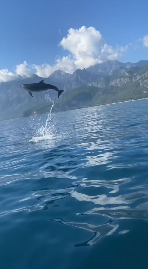Antalya’nın önemli turizm merkezleri arasındaki Kemer ilçesinde tekneyle gezintiye çıkan vatandaşlar bir anda yunusla karşılaştı. Küçük balıkçı teknelerinin arasından çıkan yunus, metrelerce havalanıp suya dalıp çıktı. Yunusun kendilerine eşlik ettiğini gören teknedekiler hem heyecan yaşadı hem de o anları görüntüledi. O sırada bir kadının ise yunusun şovu karşısında kahkaha attığı duyularak, “Sırılsıklam oldum, delirdi bu, çılgın” dediği duyuldu. Bir süre tekneyle ilerleyen yunus daha sonra gözlerden kayboldu.