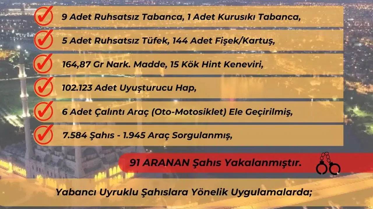 Yüreğir İlçe Emniyet Müdürlüğü ekiplerince son bir haftada gerçekleştirilen çalışmalarda, çeşitli suçlardan aranan 91 şüphelinin yakalandığı bildirildi. 23-29 Temmuz tarihlerinde gerçekleştirilen denetim ve operasyonlarda; 9 ruhsatsız tabanca, 1 kurusıkı tabanca, 5 ruhsatsız tüfek, 144 fişek-kartuş, 164 gram narkotik madde ile 102 bin 123 uyuşturucu hap ele geçirildi. Motosiklet ve araçlara yönelik gerçekleştirilen uygulamalar çerçevesinde ilçe genelinde bin 945 araç ve motosiklet sorgulanırken, 6 araç-motosiklet çalıntı halde yakalandı.
