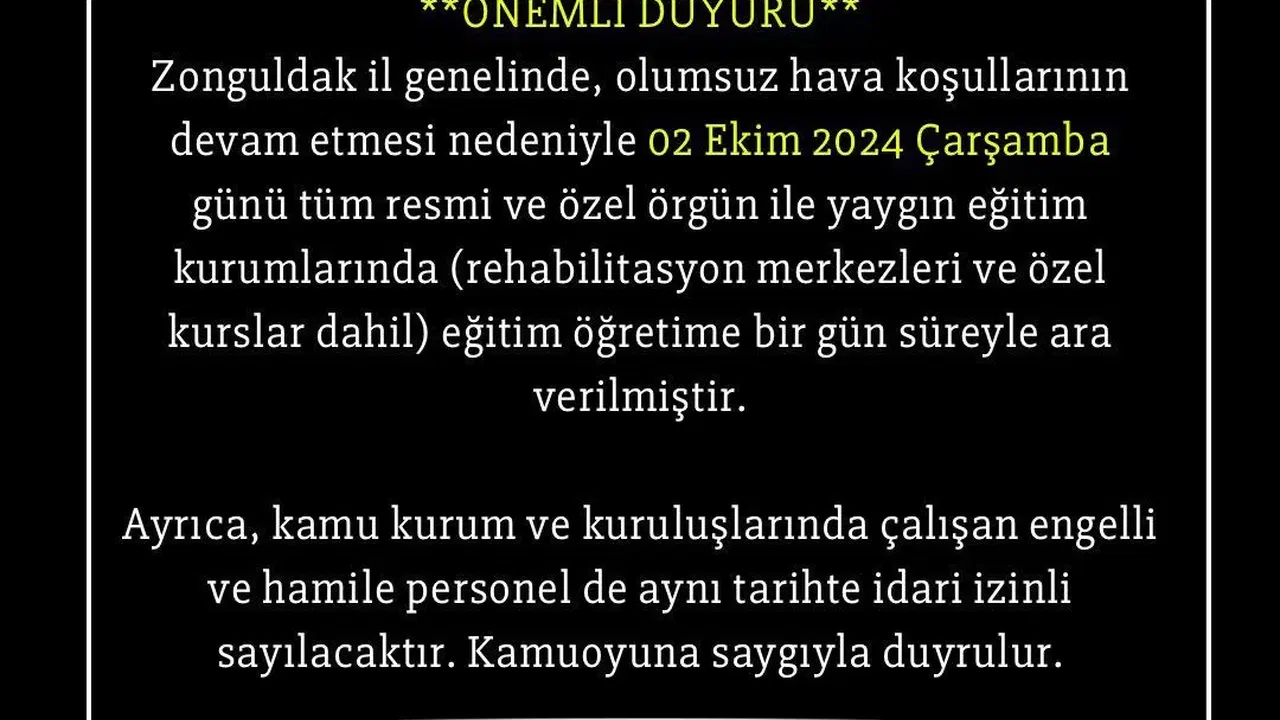 Valilikten yapılan açıklamada, "Zonguldak il genelinde, oluşmuş hava şartlarının devam etmesi nedeniyle 2 Ekim Çarşamba günü tüm resmi ve özel örgün ile yaygın eğitim kurumlarında eğitim ve öğretime 1 gün süreyle ara verilmiştir" denildi.