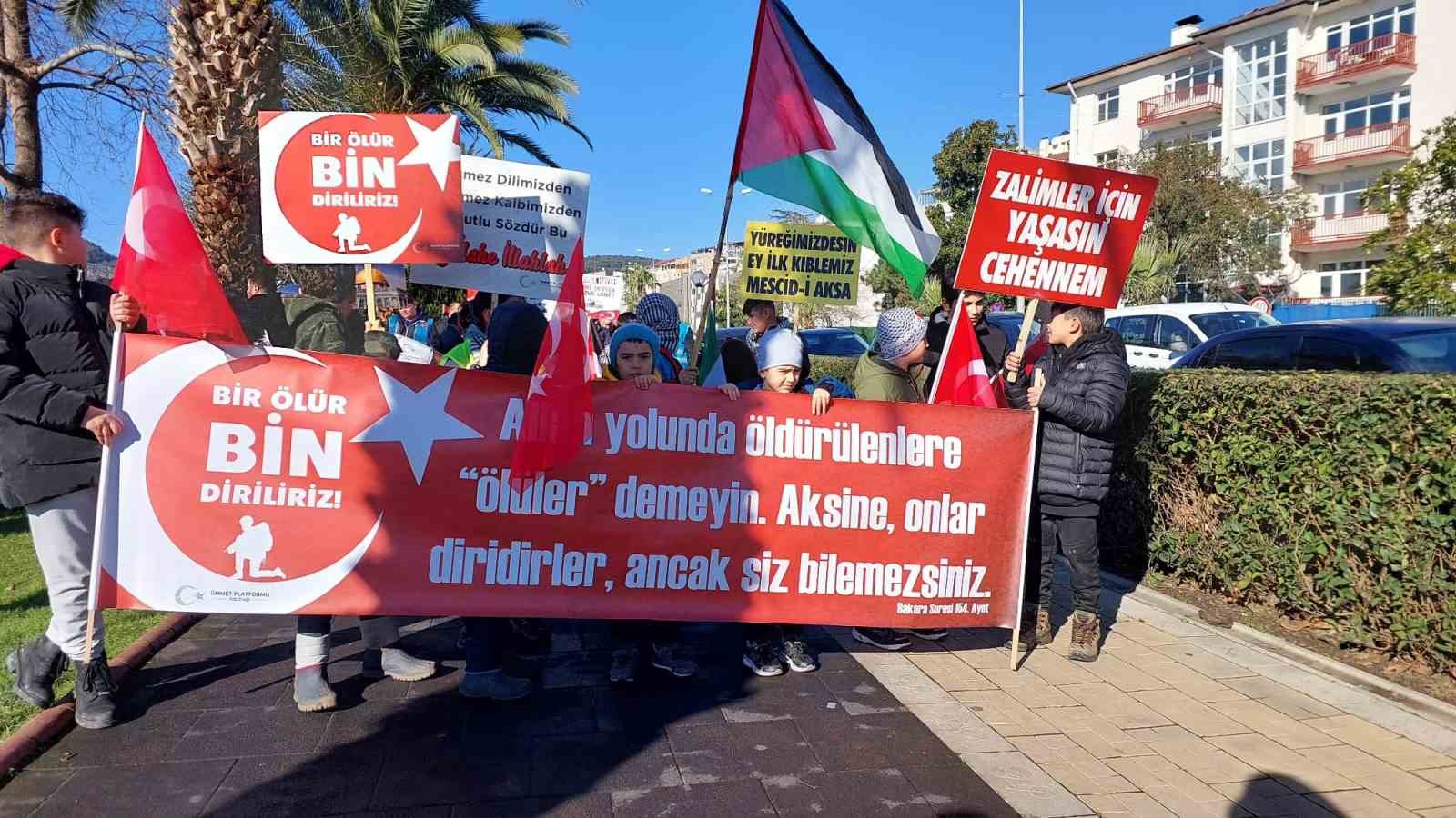Atatürk Bulvarı önünde bir araya gelen grup, ellerinde Türk ve Filistin bayraklarıyla sahil güzergahından Gazi Alemdar Müze Gemisi önüne kadar yürüdü. Terör örgütü PKK ile İsrail aleyhine slogan atan katılımcılar, kendileri için ayrılan alanda toplandı. Burada Kur’an-ı Kerim okundu.